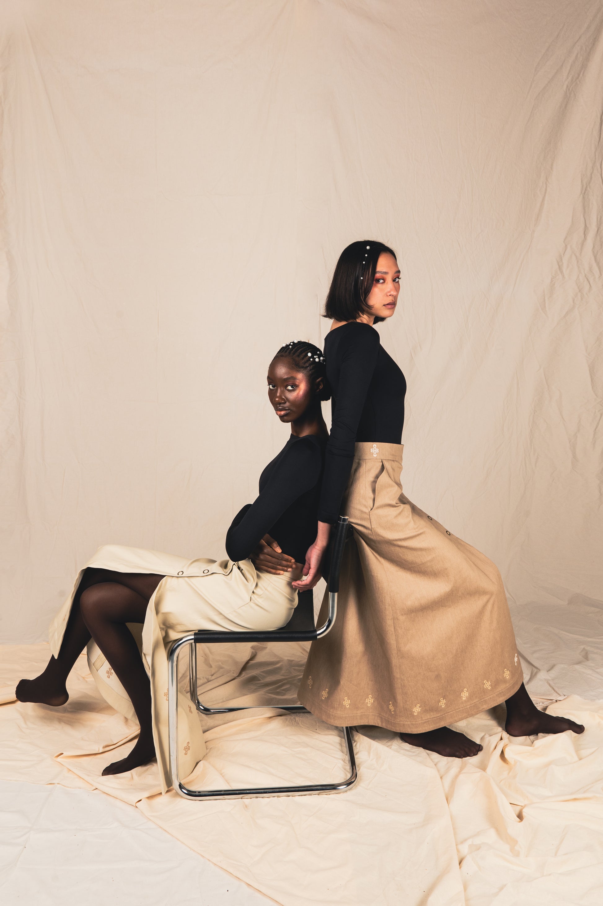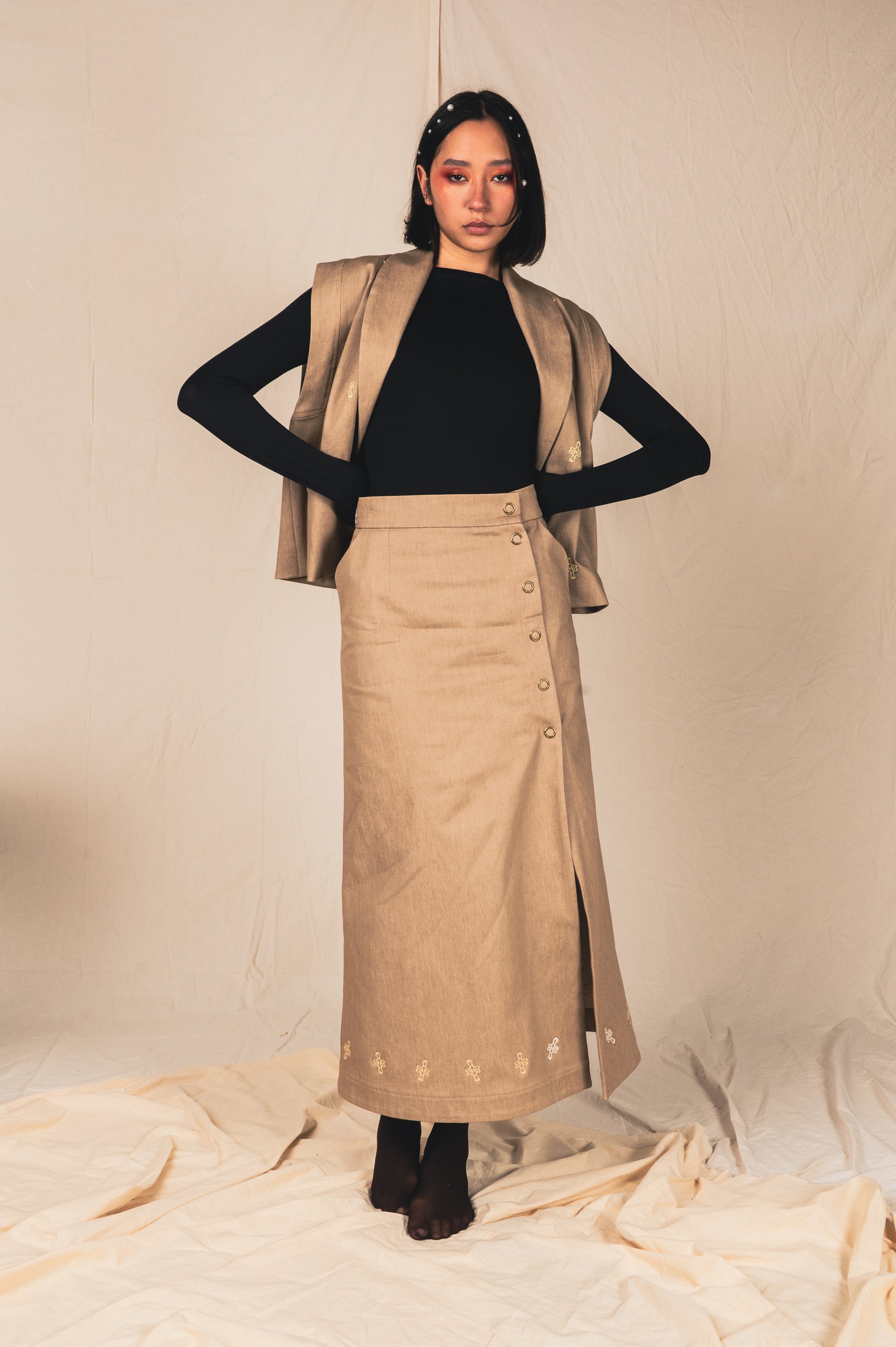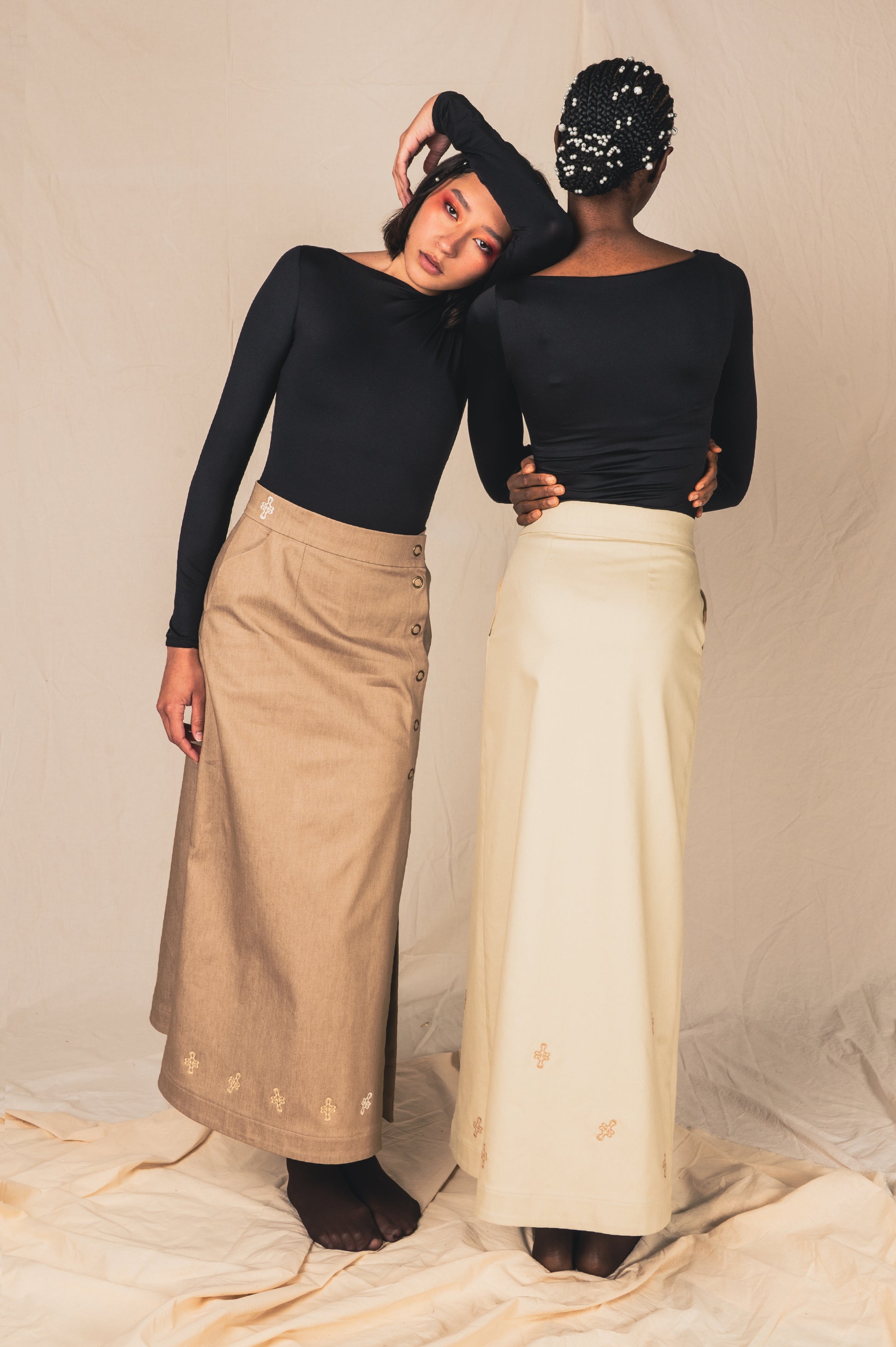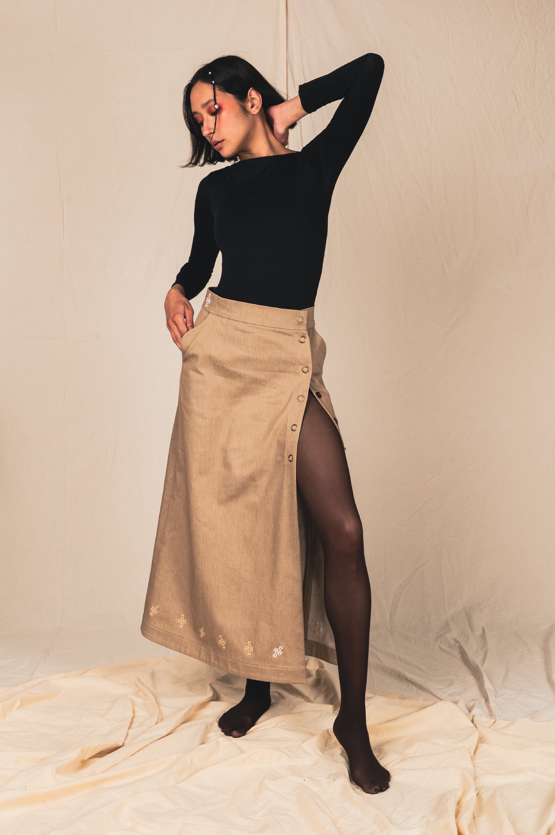 -Broderies linéaires le long du bas de jupe